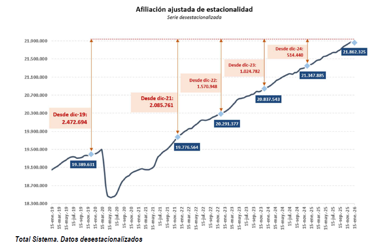 • La afiliación se ha situado en los 21.862.325 de afiliados a mitad de enero en términos desestacionalizados
