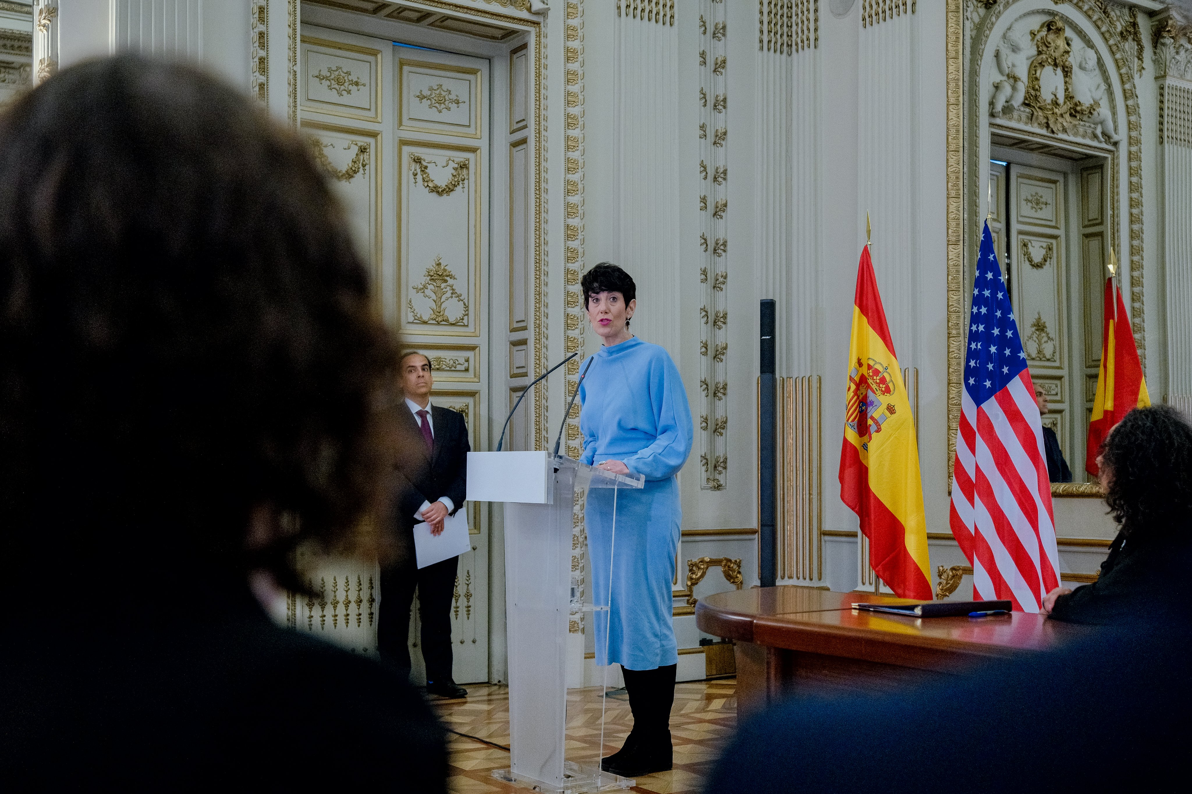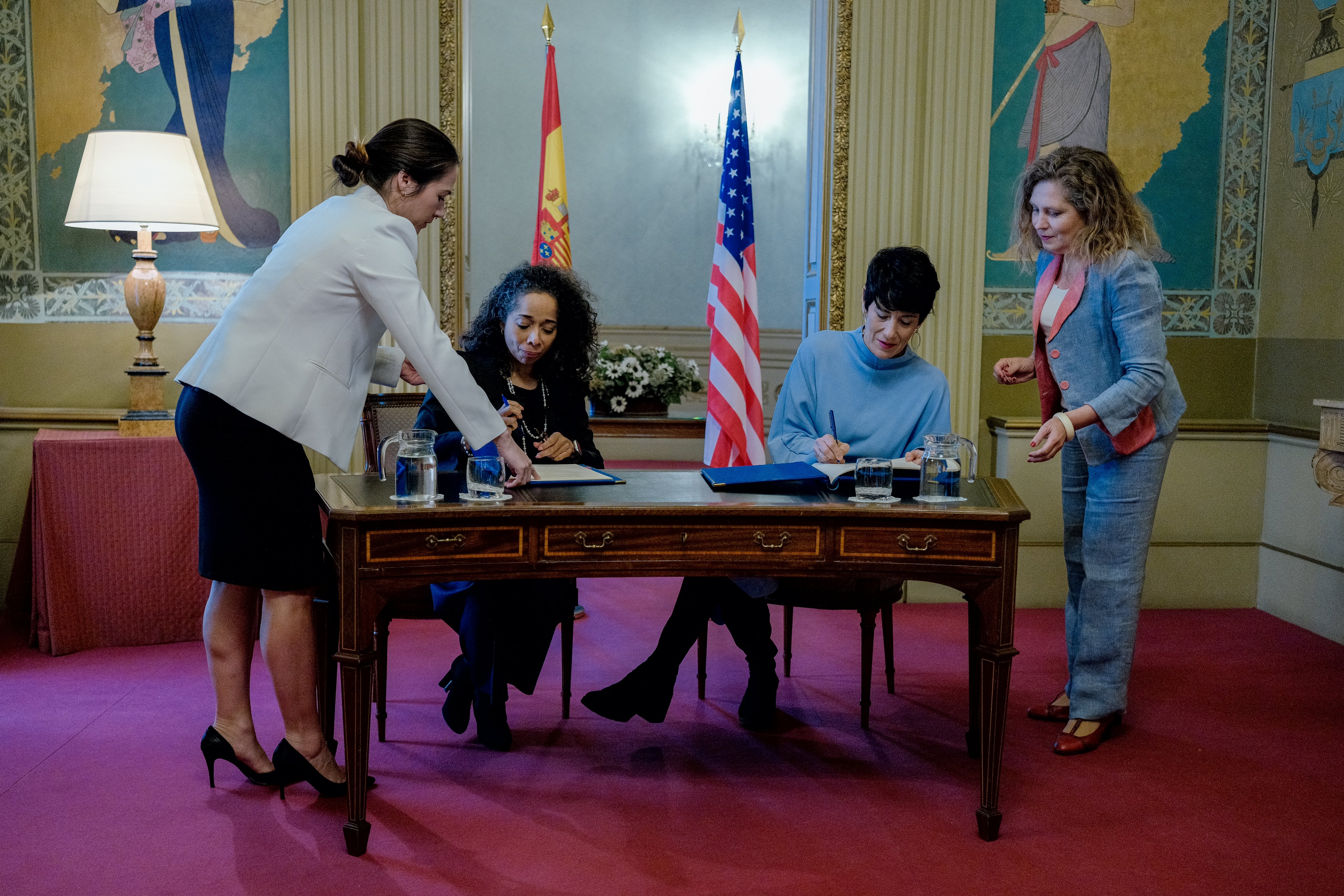 La Ministra de Inclusión, Seguridad Social y Migraciones, Elma Saiz, en la firma del Convenio, junto a Julissa Reynoso, embajadora de EE.UU. en España