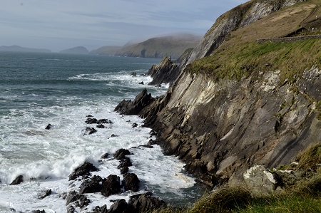La abrupta costa atlántica en el Cabo Slea (Slea Head). Al fondo, las Blasket Island