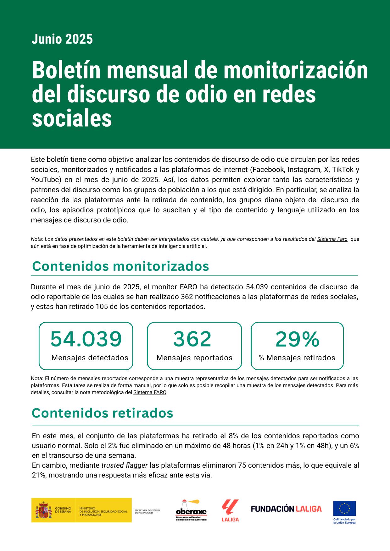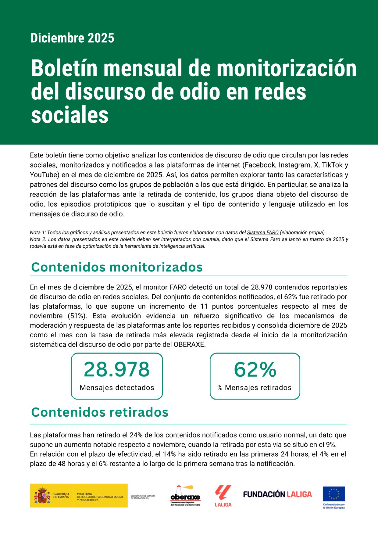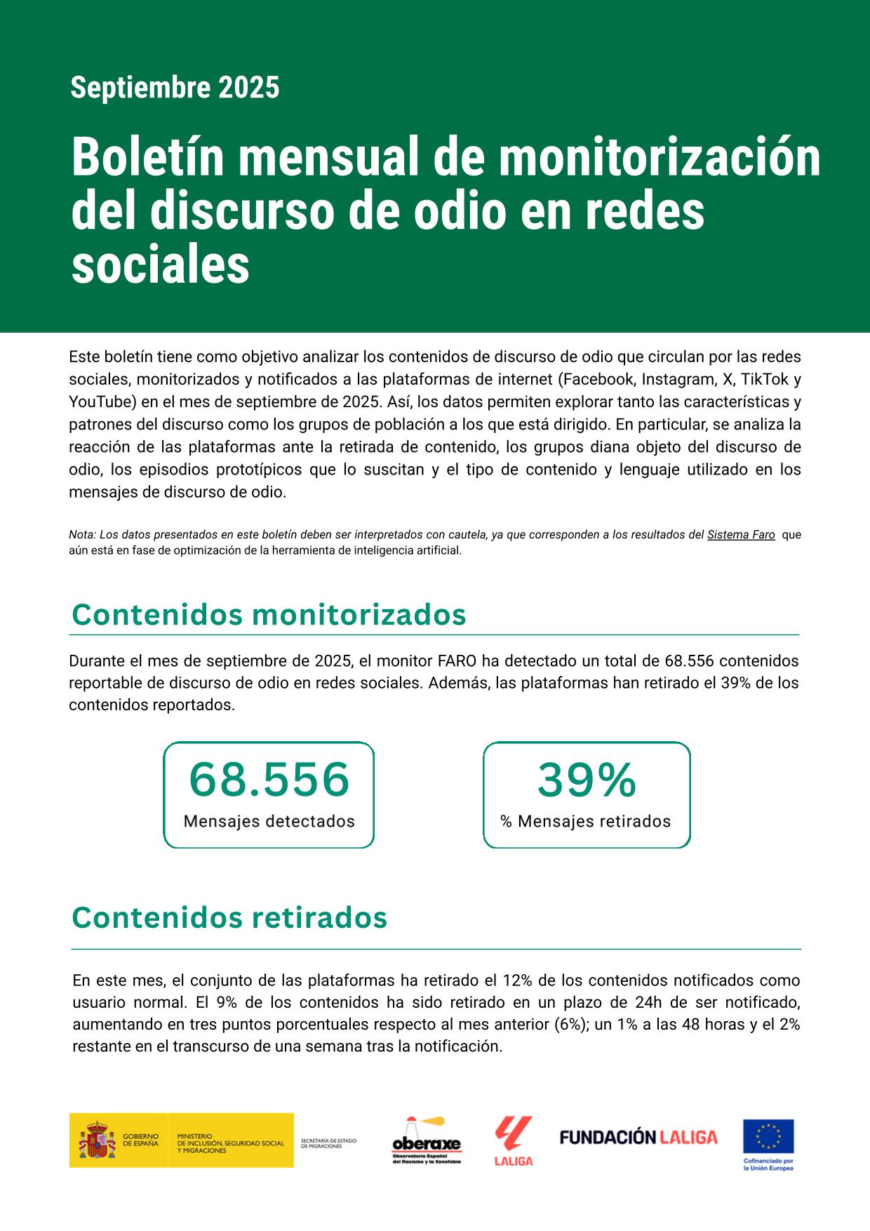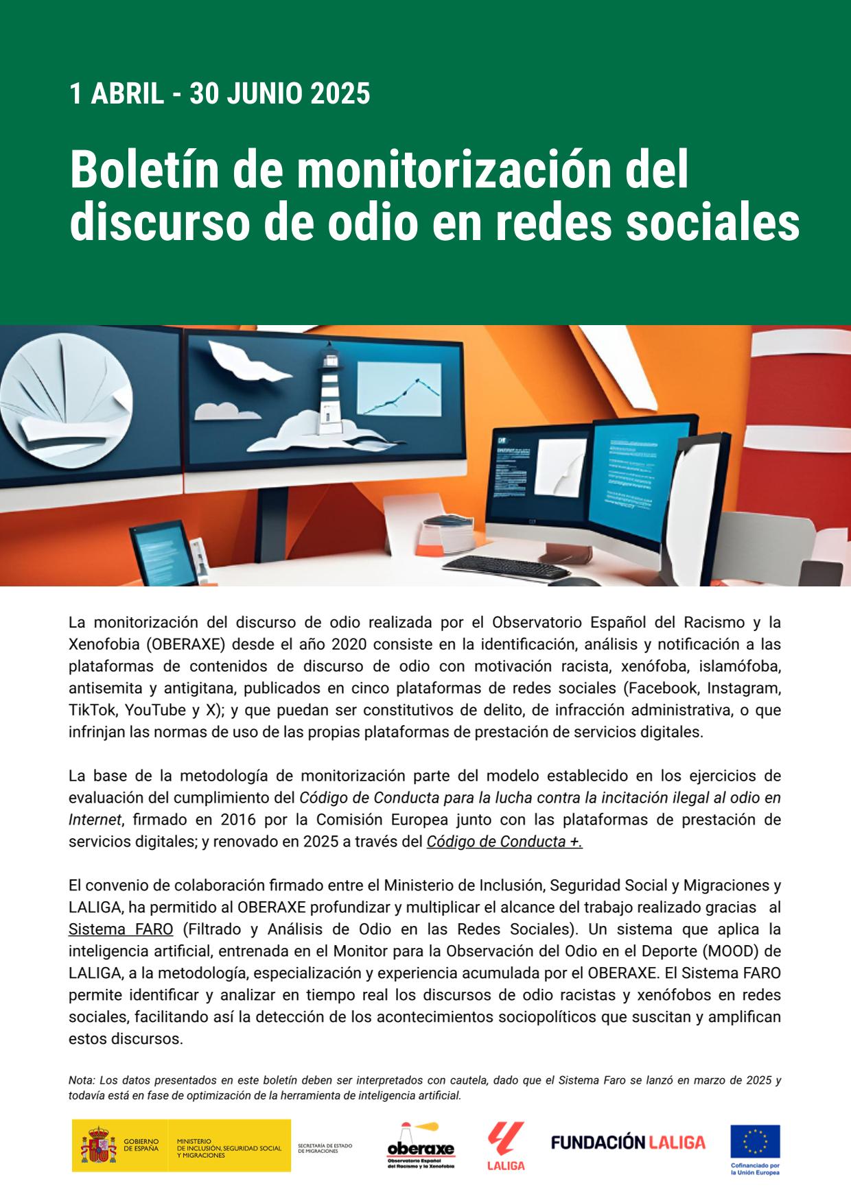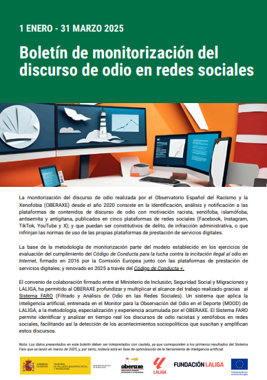 La monitorización del discurso de odio en las redes sociales que realiza el OBERAXE consiste en la búsqueda, recopilación, análisis y notificación a las plataformas, de contenidos de discurso de odio con motivación racista, xenófoba, islamófoba, antisemita y antigitana que puedan ser constitutivos de delito, de infracción administrativa, o que infrinjan las normas de uso de las propias plataformas de prestación de servicios digitales.