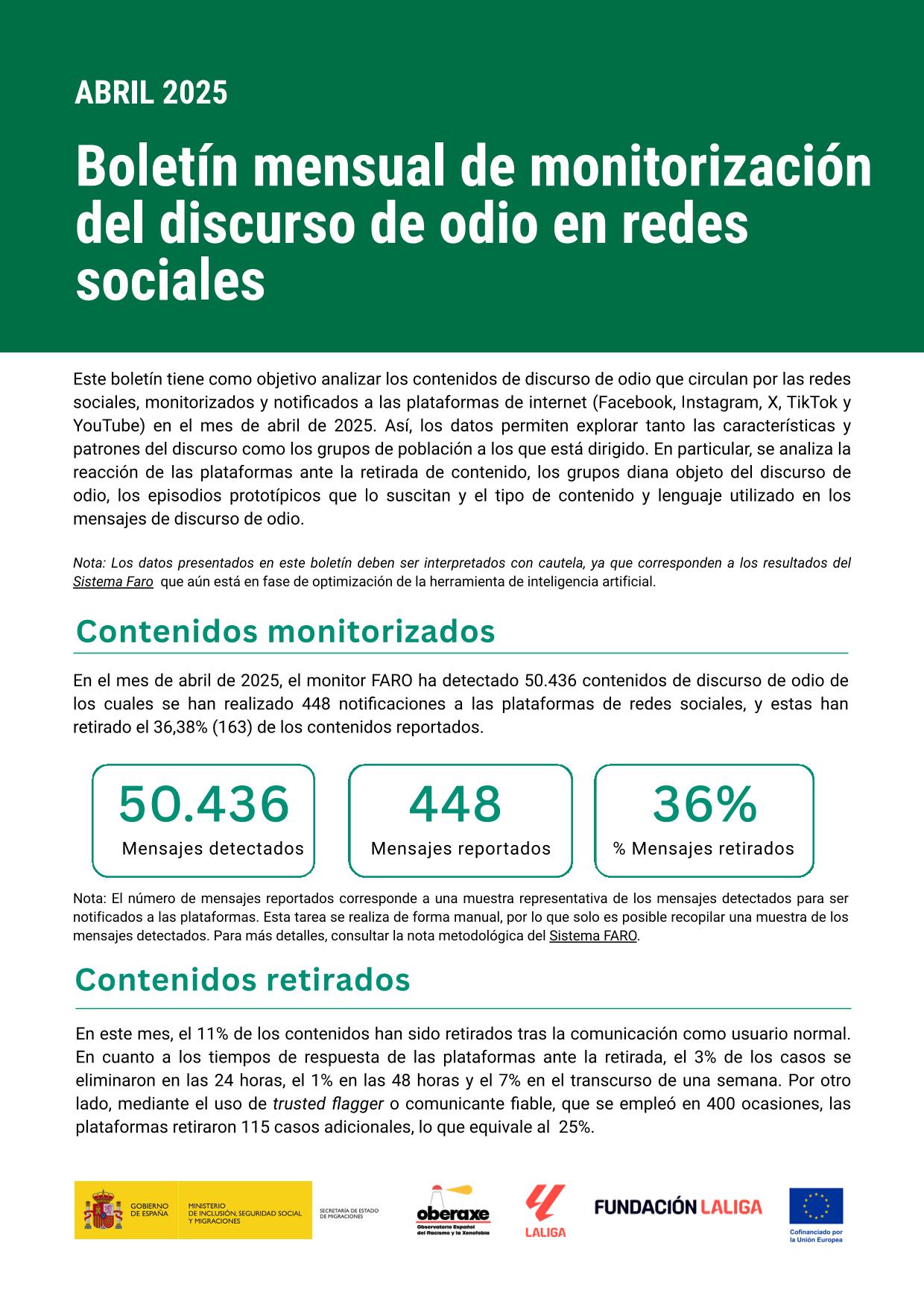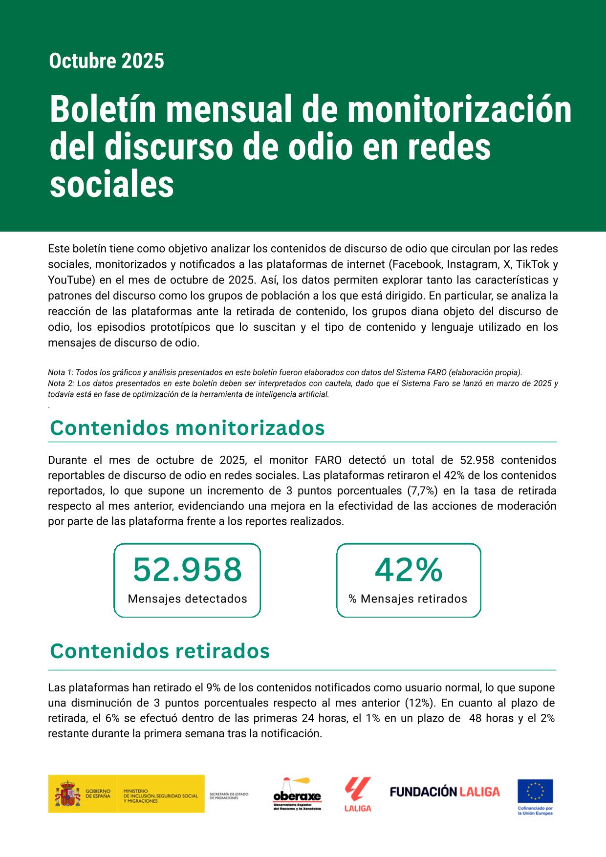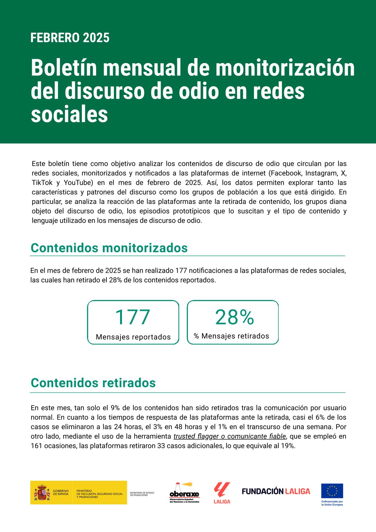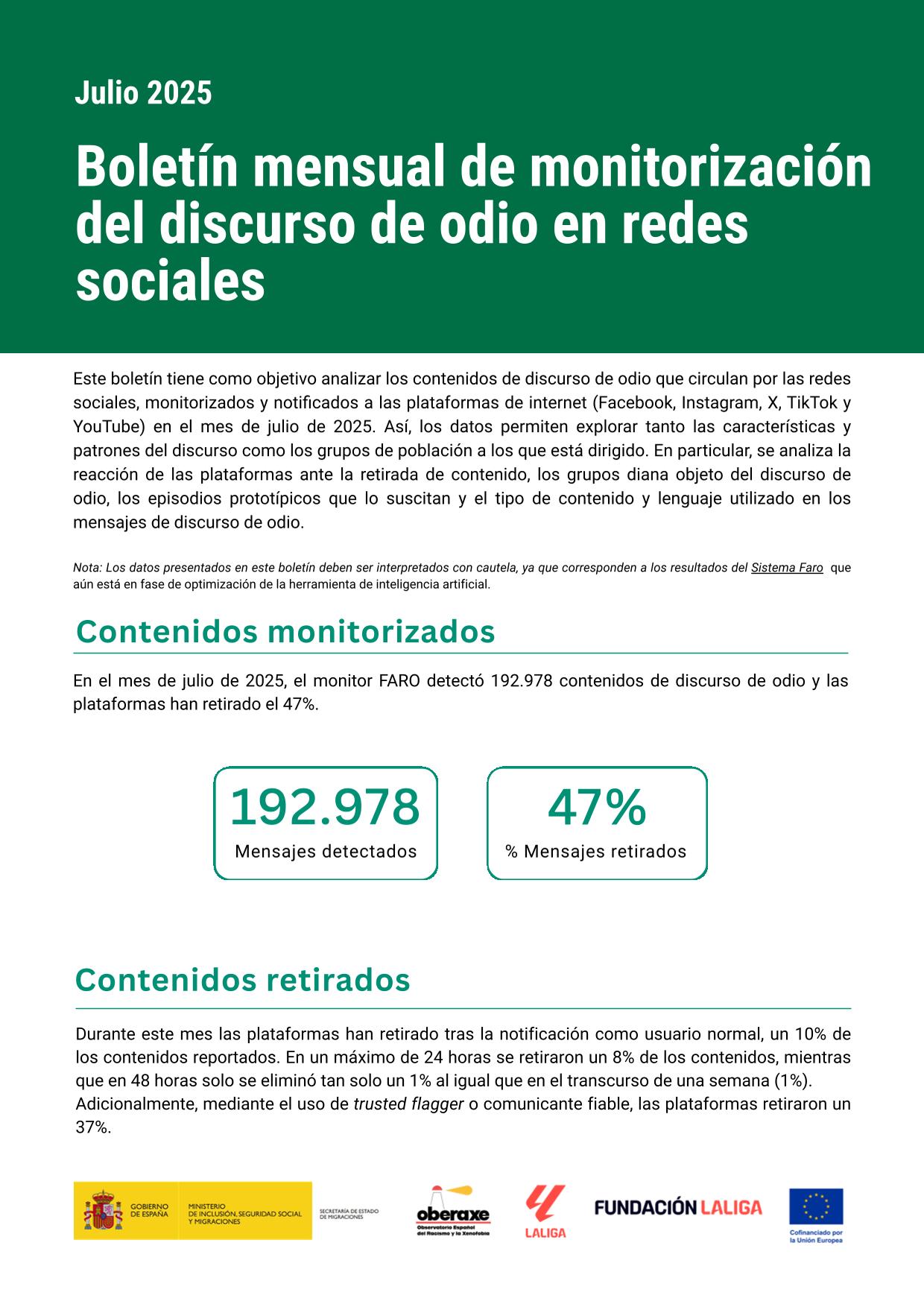La monitorización del discurso de odio en las redes sociales que realiza el OBERAXE consiste en la búsqueda, recopilación, análisis y notificación a las plataformas, de contenidos de discurso de odio con motivación racista, xenófoba, islamófoba, antisemita y antigitana que puedan ser constitutivos de delito, de infracción administrativa, o que infrinjan las normas de uso de las propias plataformas de prestación de servicios digitales.