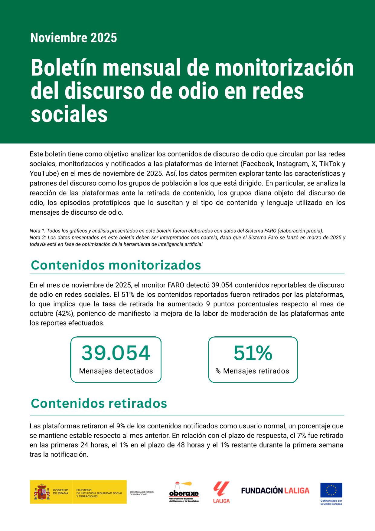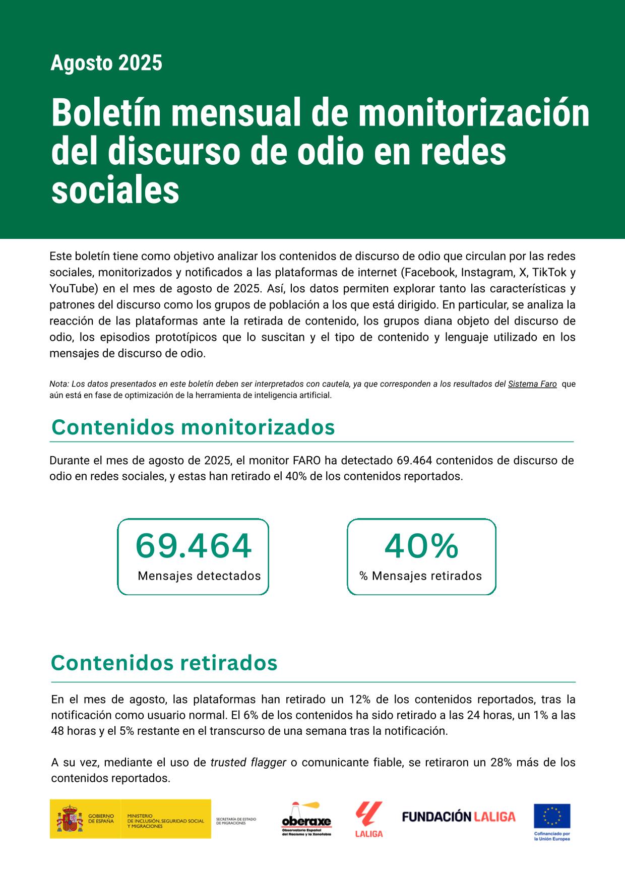 En el año 2024, el convenio de colaboración firmado entre el Ministerio de Inclusión, Seguridad Social y Migraciones y LALIGA, ha permitido al OBERAXE profundizar y multiplicar el alcance del trabajo realizado a través del nuevo Sistema FARO (Filtrado y Análisis de Odio en las Redes Sociales). Un sistema que aplica la inteligencia artificial, entrenada en el Monitor para la Observación del Odio en el Deporte (MOOD) de LALIGA, a la metodología, especialización y experiencia acumulada por el OBERAXE.