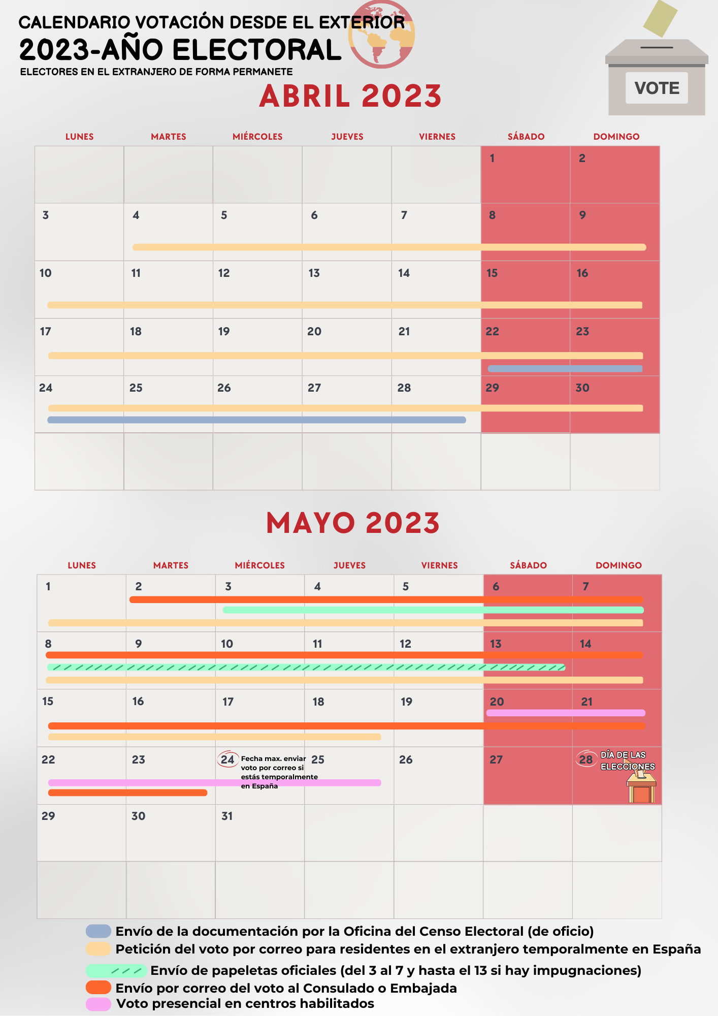 La Oficina del Censo Electoral enviará de oficio la documentación para votar a los electores en el extranjero entre el 22 y el 28 de abril. Además, se habilita un enlace para descargar las papeletas por vía telemática y hasta el 23 de mayo se podrá enviar el sufragio por vía postal al consulado.