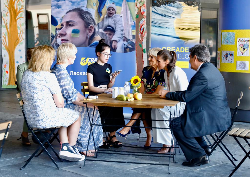 Durante la visita, doña Letizia y la doctora Biden han conversado con varias de las familias ucranianas acogidas en el centro, con las que han podido conocer la realidad del conflicto y el funcionamiento del sistema de atención a los desplazados que ha puesto en marcha España. También han celebrado un encuentro con representantes de las instituciones y organizaciones que ayudan a los usuarios del centro con distintos servicios, desde la documentación a la orientación sociolaboral pasando por la atención psicológica y sanitaria: Policía, ACNUR, ACCEM, Cruz Roja Española, UNICEF, Confederación Salud Mental Española y Fundación CEOE, además del propio Ministerio de Inclusión.