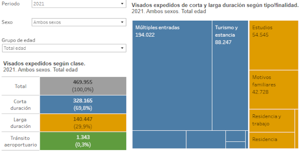 Visados expedidos durante el año de referencia en las misiones diplomáticas u oficinas consulares españolas; no se incluyen los visados expedidos en las fronteras exteriores