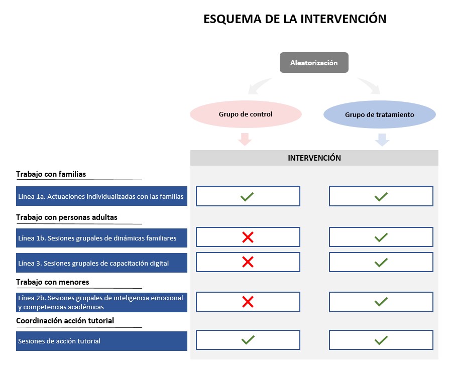 La intervención, que duró 7 meses, desarrolló actividades en el ámbito educativo. Las familias participantes fueron asignadas aleatoriamente entre el grupo de intervención o tratamiento y el grupo de control o comparación. Todas las familias que participaron en la intervención contaron con actuaciones individualizadas tanto para las personas adultas como para las menores, así como con sesiones de acción tutorial dirigidas a la coordinación del trabajo entre los centros educativos y los equipos de acompañamiento familiar. A todos ellos se les ofreció la cartera de servicios ordinaria de los servicios sociales comunitarios, en base a su diagnóstico sociofamiliar, y se les orientó hacia los recursos comunitarios de cada entidad local. Las familias del grupo de intervención, en base a su diagnóstico, contaron además con una serie de recursos que incidían en la reducción del absentismo escolar: sesiones grupales de dinámicas familiares y sesiones grupales de competencias digitales dirigidas a las personas adultas de la unidad familiar y sesiones grupales de autoestima, inteligencia emocional y competencias académicas en matemáticas y lenguaje, dirigidas a personas menores. A las familias del grupo de comparación únicamente se les ofreció la cartera de servicios ordinaria de los servicios sociales comunitarios, tanto para personas adultas como para menores. 2.313 hogares participaron en la evaluación, de los cuales 1.447 fueron asignados a un grupo titular y 866 a un grupo de reserva. De los hogares titulares, 724 fueron asignados aleatoriamente al grupo de tratamiento y 723 al grupo de control.