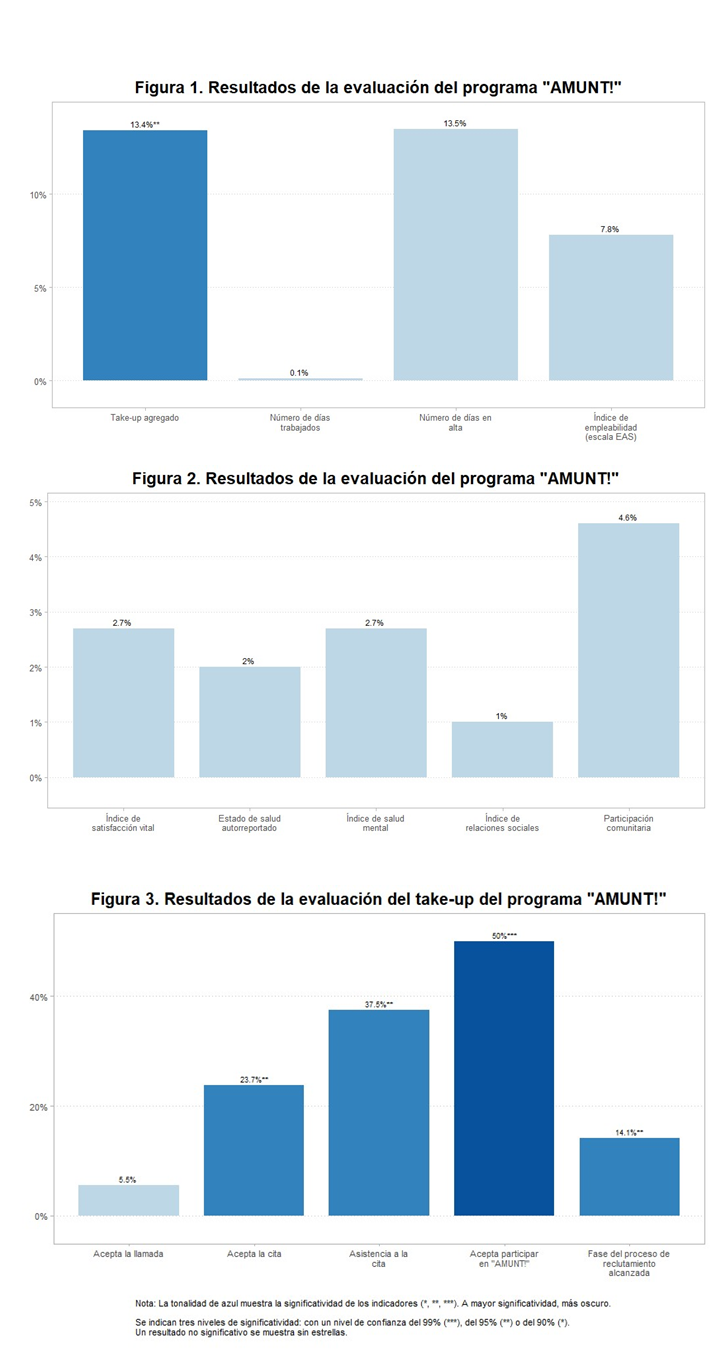 El proyecto “AMUNT!” evaluó una intervención para la mejora de la integración sociolaboral a través de un modelo de "ventanilla única", donde se diseñó un itinerario personalizado para cada participante. En este itinerario se definieron acciones incluyendo la formación laboral, las prácticas laborales y la participación comunitaria. Adicionalmente, y tras constatar una baja adhesión a la primera fase del proyecto, se realizó un nuevo estudio para la evaluación del take-up (tasa de aceptación) del proyecto. Esta segunda fase del proyecto evaluó el efecto de proporcionar un mensaje más claro y motivacional en el grado de participación en las distintas fases del programa.
