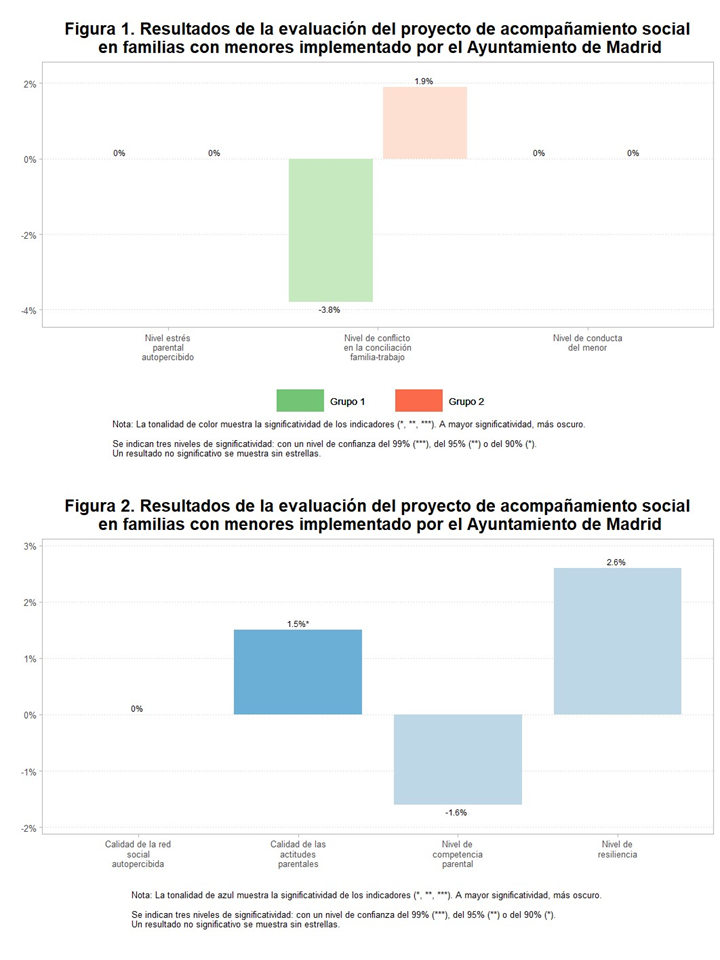 El proyecto de acompañamiento social en familias con menores implementado por el Ayuntamiento de Madrid pretendió promover el desarrollo y fortalecimiento de las competencias emocionales, educativas y parentales de las familias beneficiarias del proyecto (bienestar psicosocial y educativo); favorecer la conciliación de la vida laboral y familiar de hogares beneficiarios del Ingreso Mínimo Vital (IMV) o de la Renta Mínima de Inserción (RMI) y contribuir a la mejora de la empleabilidad de las familias. El acompañamiento social ofrecido a las familias consistió en un programa sociolaboral para mejorar la empleabilidad de las personas adultas, ayudas a la conciliación de la vida familiar y laboral y un programa psicoeducativo para promover la parentalidad positiva y el desarrollo infantil. La evaluación de este proyecto ha permitido generar evidencia sobre si las familias en situación de vulnerabilidad con personas menores a cargo pueden incrementar su nivel de bienestar y recuperar su autonomía cuando se les proporciona apoyo familiar durante un tiempo en el cuidado y la educación de sus hijos/as. En concreto, la evaluación ha permitido estimar y comparar los impactos del programa psicoeducativo y de las ayudas a la conciliación.