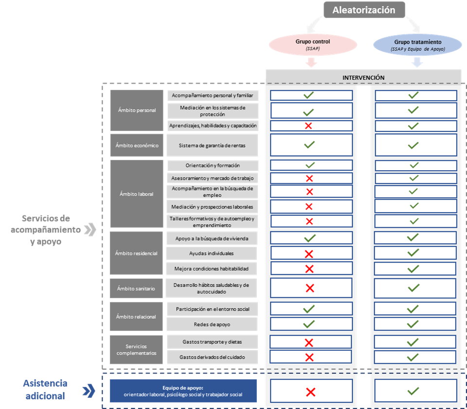 Dada la naturaleza multidimensional de la exclusión social y laboral, el objetivo de la intervención fue poner a disposición de las participantes una oferta de acciones específicas en función de las necesidades identificadas en cada unidad de convivencia. La intervención, que duró 11 meses, desarrolló actividades en los ámbitos de acompañamiento social y non take-up y de intervención integral. Las personas participantes se asignaron aleatoriamente entre el grupo de tratamiento o intervención y el grupo de control o comparación. El grupo de comparación recibió las acciones habitualmente ofrecidas en los SSAP, mientras que el grupo de intervención fue objeto de una cartera más amplia de actuaciones, junto con la atención integral de un Equipo de Apoyo formado por una persona orientadora laboral, otra psicóloga social y otra trabajadora social. Los ámbitos de intervención fueron, principalmente, los siguientes: laboral, personal, económico, sanitario, formativo, residencial y relacional. Adicionalmente se distribuyeron ayudas económicas para la conciliación. 1.652 mujeres que aceptan participar en el proyecto, siendo asignadas aleatoriamente (826 en el grupo de control y 826 en el grupo de tratamiento).