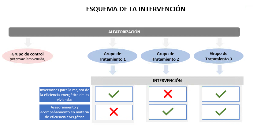La intervención, que duró 7 meses, desarrolló actividades en los ámbitos de acompañamiento social y non take-up, y de vivienda y pobreza energética. Las familias se asignaron aleatoriamente tres grupos de tratamiento o intervención y un grupo de control o comparación. El objetivo era contrastar el impacto de intervenciones sobre la disminución de la pobreza energética de colectivos en riesgo de exclusión social en Cataluña. Concretamente, se buscaba evaluar si, por un lado, los procesos de formación y asesoramiento en hábitos de consumo energético doméstico y, por otro, las inversiones de mejora de la eficiencia energética en las viviendas eran efectivos y en qué grado, la combinación de ambas acciones, podrían reducir la pobreza energética. De esta forma, el grupo de tratamiento 1 recibe inversiones para la mejora de la eficiencia energética en su vivienda, el grupo de tratamiento 2 recibe asesoramiento y acompañamiento en materia de eficiencia energética y el grupo de tratamiento 3 recibe ambas actuaciones (asesoramiento e inversiones para la mejora de la eficiencia energética). Además, se realizaron dos actuaciones satélites con los siguientes objetivos: (i) mejorar la situación de las personas participantes con relación a sus ingresos mínimos, acompañándolas hacia la obtención de rentas a través del Ingreso Mínimo Vital; y (ii) romper con las situaciones de aislamiento social que pudiesen sufrir las personas participantes en el programa y que representasen un obstáculo para su progreso social. Para la evaluación, se plantean tres grupos de tratamiento y uno de control que no recibe ninguna intervención. Cada grupo de tratamiento se formó con 500 unidades familiares, y el de control con 492. Cada grupo de tratamiento recibe diferentes combinaciones de las dos intervenciones principales (formación e inversión), en un esquema de evaluación que se denomina 2x2. El primer grupo de tratamiento recibe sólo las inversiones, el segundo grupo recibe sólo el asesoramiento-formación, el tercer grupo recibe ambas intervenciones.
