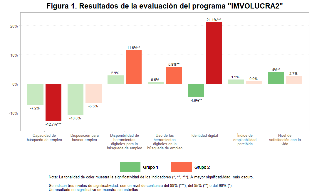 El proyecto IMVOLUCRA2 pretendió evaluar si el entrenamiento en competencias personales básicas tenía un efecto positivo en la empleabilidad y en la búsqueda de empleo. Un segundo objetivo fue evaluar si el entrenamiento en actividades digitales para el empleo tenía un efecto complementario con las competencias personales básicas sobre la empleabilidad y la búsqueda de empleo.