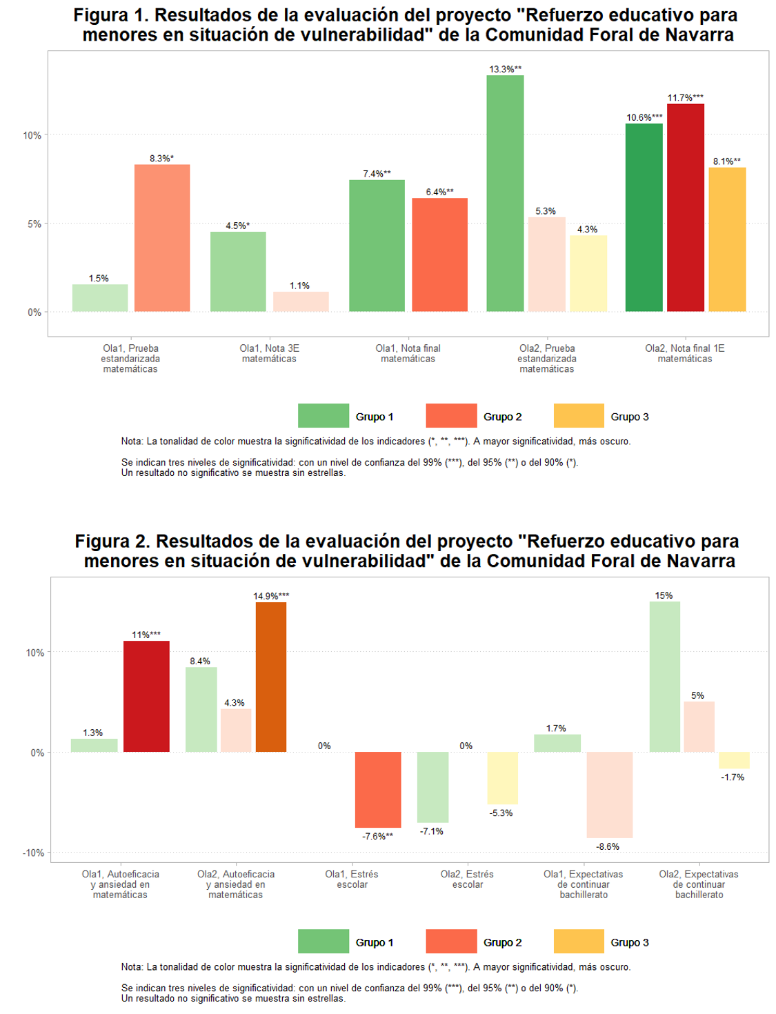 Las Figuras 1 y 2 muestran el porcentaje incremental de cada indicador de resultado principal (medido al final de la intervención) para cada grupo de tratamiento comparado con el grupo de control.