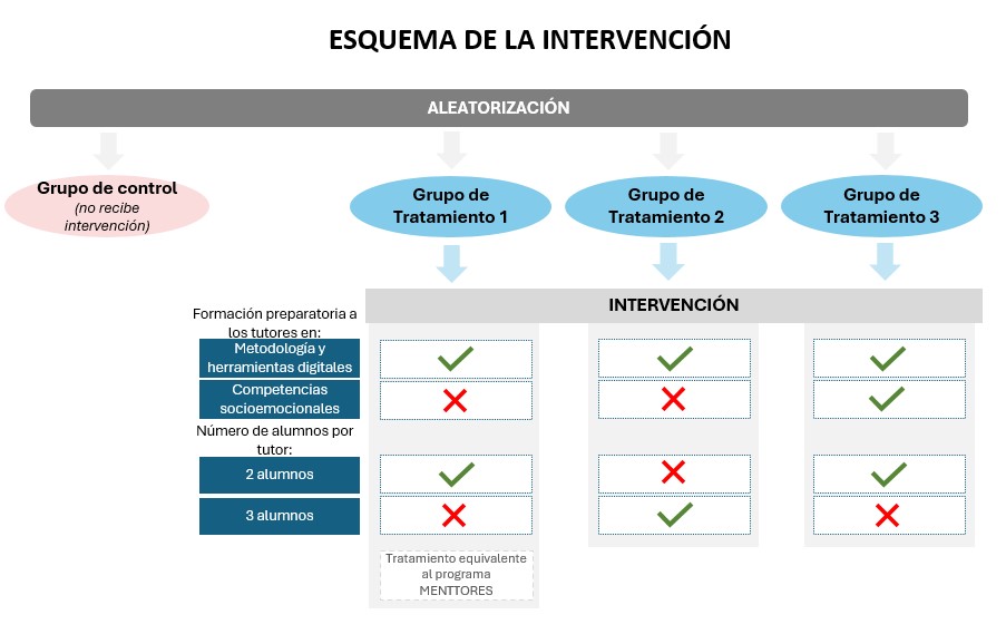 La intervención, que estuvo compuesta por dos olas de 8 semanas, desarrolló actividades en el ámbito educativo. Las personas estudiantes fueron asignadas aleatoriamente entre tres grupos de tratamiento o intervención y un grupo de control o comparación. La intervención en cada grupo consistía en tutorías en línea en matemáticas en horario extraescolar, con dos sesiones de 1,5 horas a la semana. Las tutorías las realizaron profesionales docentes que habían recibido formación en metodología y herramientas digitales. Las tutorías se configuraban de forma distinta en cada grupo: en el grupo 1 se impartían tutorías de dos estudiantes por tutor; en el grupo 2 se trataba de tutorías de tres estudiantes por tutor; y en el grupo 3 se impartían tutorías de dos estudiantes por tutor, en los que el tutor había recibido formación adicional en competencias socioemocionales. El grupo de control no recibió ningún servicio por parte del programa. 1.344 personas de 46 centros educativos participaron en este proyecto, de las cuales 971 fueron asignadas aleatoriamente a los grupos de tratamiento y 373 fueron asignadas al grupo de control.