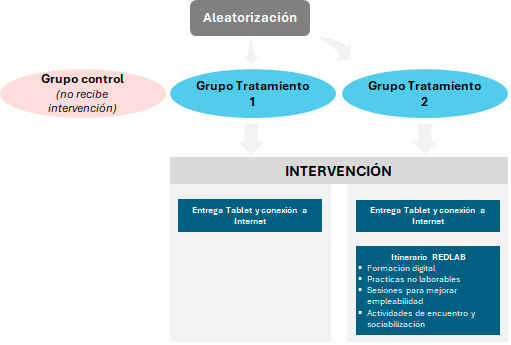 La intervención se dividió en dos olas (REDLAB 1 y REDLAB 2). Ambas desarrollaron actividades en los ámbitos de digitalización, y de trabajo y emprendimiento. Las personas participantes de REDLAB1, cuya duración fue de 5 meses, se asignaron aleatoriamente entre dos grupos de tratamiento o intervención y un grupo de control o comparación. El grupo de tratamiento 1 recibió un kit digital (Tablet, teclado, funda y auriculares) con conexión a internet por un año. El grupo de tratamiento 2, además de la entrega del kit digital, que recibió también el grupo de intervención 1, desarrolló el itinerario REDLAB, que incluyó 100 horas en alfabetización digital, un asesoramiento personalizado y unas prácticas no laborales monitorizadas de 30 horas. El grupo de comparación, por su parte, no recibió ninguna entrega de equipamiento ni llevó a cabo ningún itinerario. Por otro lado, las personas participantes de REDLAB2, que duró 3 meses, se asignaron aleatoriamente entre el grupo de tratamiento o intervención y el grupo de control o comparación. Al grupo de intervención se le proporcionó información detallada del aula donde se realizaría la acción formativa. Se les indicaba en un mensaje la dirección del centro, la duración y el horario del curso, así como otros incentivos y facilidades a la asistencia. Al grupo de comparación se le proporcionó información genérica sobre la acción formativa indicando que, si las personas participantes se encontraban interesadas, recibirían posteriormente más información sobre la misma. Todos aquellos que aceptaron participar, tanto del grupo de tratamiento como del grupo de control, recibieron el kit digital y la acción formativa, al igual que el grupo de intervención 2 de REDLAB1. 2.968 personas participaron en la primera fase de este proyecto, de las cuales 988 fueron asignadas aleatoriamente al grupo de tratamiento 1 (GT1, que recibe solo el kit digital), 994 fueron asignadas al grupo de tratamiento 2 (GT2, que recibe el kit digital y la formación) y 986 fueron asignadas al grupo de control (GC, que no recibe ninguna intervención). En relación con la segunda fase, 2.200 personas fueron contactadas telefónicamente para realizar la encuesta (determinando su elegibilidad), siendo asignadas la mitad al grupo de tratamiento y la mitad al grupo de control. De ellas, 375 respondieron a la encuesta, cumplían los criterios de participación, y aceptaron participar en la acción formativa.