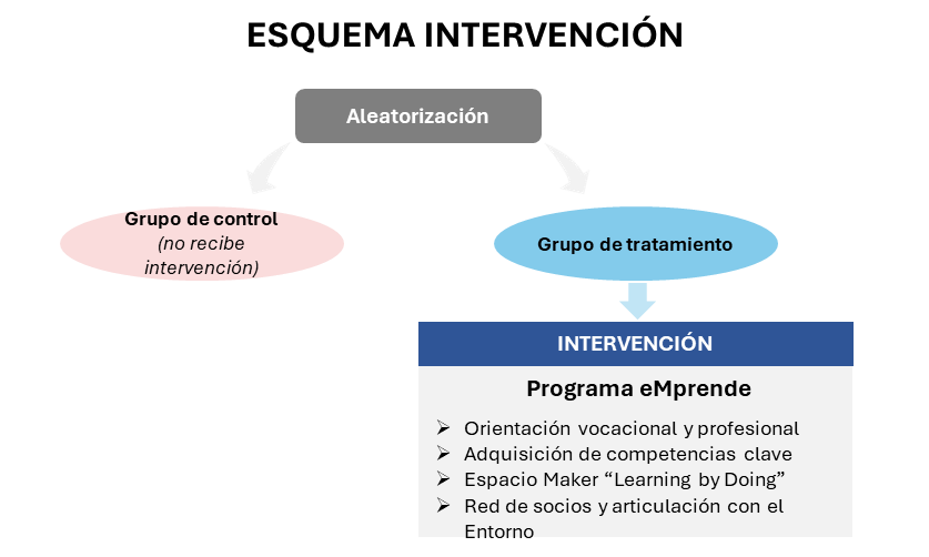 La intervención, que duró 12 meses, desarrolló actividades en los ámbitos de educación y trabajo y emprendimiento. Los centros educativos participantes se asignaron aleatoriamente entre el grupo de intervención o tratamiento, y el grupo de comparación o control. El alumnado de los centros educativos que formaban parte del grupo de intervención recobió un acompañamiento y asesoramiento educativo-psicológico–social (individual y grupal). Se organizaron sesiones que ofrecían orientación vocacional y profesional y la adquisición de competencias clave o “blandas” (‘Soft Vocational Skills’, traducidas al español como competencias emprendedoras y competencias digitales). Estas actividades se ofrecieron como parte del currículo educativo, por lo que todo el alumnado matriculado durante el curso 2022-2023 en los centros que conformaban el grupo de intervención pudieron participar en ellas. De manera complementaria, se desarrollaron otras acciones en relación con el apoyo psicosocial y con el entorno comunitario y el tejido empresarial local. El alumnado de los centros educativos que configuraban el grupo de comparación o control no recibió ninguna intervención. 51 centros educativos (con 3.823 alumnos matriculados en FP en el curso 2022-2023) participaron en este proyecto, de los cuales 25 (1.800 matriculados) fueron asignados aleatoriamente al grupo de tratamiento y 26 (2.023 alumnos matriculados) fueron asignadas al grupo de control.