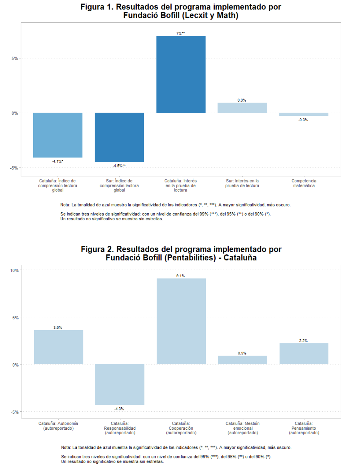 La intervención desarrolló actividades en el ámbito educativo. La intervención se dividió en la implementación de dos programas y metodologías de apoyo socioeducativo diferentes: por un lado, el Programa “LECXIT y MATH TUTORING” dirigido a diferentes aulas de estudiantes y, por otro, el Programa “PENTABILITIES” dirigido a docentes. En el Programa “LECXIT y MATH TUTORING”, la intervención “LECXIT” se llevó a cabo en las aulas de 4º de primaria y la de “MATH TUTORING en las de 6º de primaria. Los centros escolares se asignaron aleatoriamente entre el grupo de tratamiento o intervención y el grupo de control o comparación, de forma que si un centro educativo forma parte del grupo de tratamiento para “LECXIT”, entonces es parte del grupo de control para “MATH TUTORING”, y viceversa. La intervención LECXIT y MATH TUTORING duró 6 meses y las aulas del grupo de intervención recibió la siguiente intervención: • Las clases del grupo de intervención que participaron en el programa LECXIT lo hicieron a razón de 5 por clase, en el formato de parejas “estudiante-persona mentora”. La persona mentora participaba en el proyecto sin contraprestación económica. • Las clases del grupo de intervención que participaron en el programa MATH TUTORING lo hicieron en grupos de 6 por cada tutoría presencial semanal, complementada con una plataforma de aprendizaje en línea. La persona técnica que realizó la mentoría era contratada por BOFILL. Para la coordinación de los programas LECXIT y MATH TUTORING hubo un equipo técnico que apoyó también a los equipos de mentores. Las aulas del grupo de comparación del programa LECXIT y MATH TUTORING no recibieron ningún tipo de intervención. En el Programa “PENTABILITIES”, los docentes del alumnado participante en la intervención se asignaron aleatoriamente entre el grupo de tratamiento o intervención y el grupo de control o comparación. La intervención PENTABILITIES duró 8 meses y los docentes del grupo de intervención recibieron la siguiente intervención: • El programa PENTABILITIES estaba enfocado a la formación y el asesoramiento de docentes de los centros seleccionados en la evaluación de habilidades personales y sociales, para integrarla en el currículo con ayuda de herramientas digitales. Las sesiones de formación y mentoría guiaron al personal docente para adaptar la dinámica del aula y planificar sesiones que permitieran promover, observar y recopilar evidencia sobre los comportamientos de las habilidades socioemocionales del alumnado. El personal docente del grupo de comparación del programa PENTABILITIES solo recibió la formación en la metodología después de finalizado el proyecto piloto. 13.271 personas participaron en estos 3 proyectos, de las que 6.743 se asignaron aleatoriamente al grupo de tratamiento y 6.528 al grupo de control.