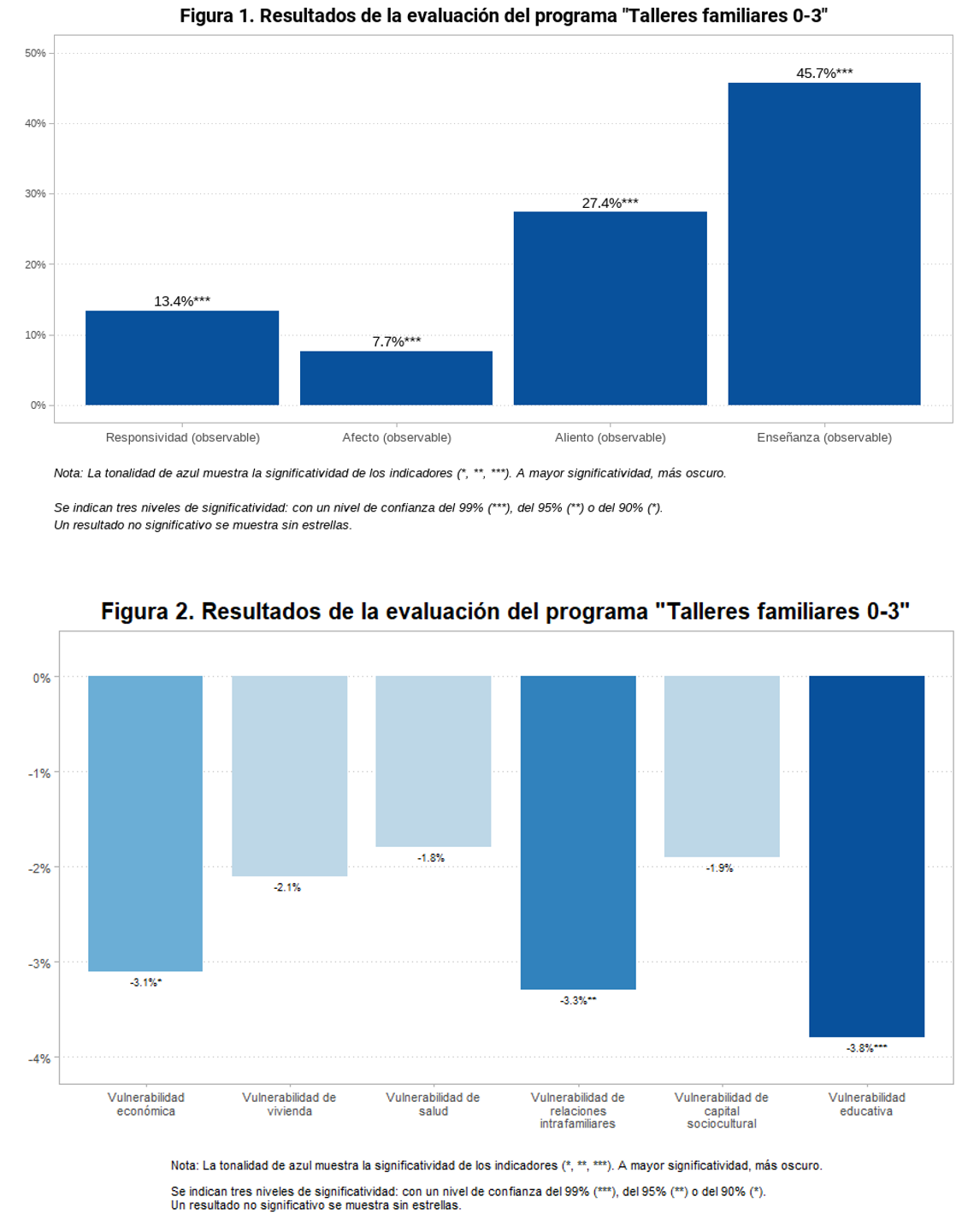 Las Figuras 1 y 2 muestran el porcentaje incremental de cada indicador de resultado principal (medido al final de la intervención) para el grupo de tratamiento comparado con el grupo de control.