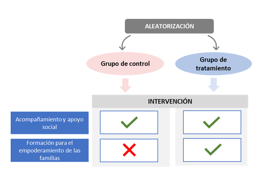 La intervención, que duró 6 meses, desarrolló actividades en el ámbito educativo y laboral. Las familias participantes se asignaron aleatoriamente entre el grupo de tratamiento o intervención y el grupo de control o comparación. Tanto el grupo de intervención como el grupo de comparación recibieron un acompañamiento y apoyo social a través de diferentes recursos durante un total de 6 meses. Estos recursos incluyeron bienes para necesidades básicas (ayuda monetaria en forma de tarjeta monedero recargable con una prestación de hasta 900 euros para la compra de productos de primera necesidad), apoyo a la inserción (a través del Programa Incorpora de Fundación “la Caixa” así como de otros servicios específicos del territorio), “servicio canguro” y encuentros entre familias. Adicionalmente, el grupo de intervención recibió una formación para el empoderamiento de las familias en competencias parentales a través de los “Talleres familiares 0-3”. Se formaron grupos de entre 6 y 8 familias que acudieron al taller, con una duración de 80 horas, distribuido en 2 sesiones semanales durante 16 semanas. Las actividades del taller se desarrollaron en base a una formación práctica aplicada a partir de la estancia conjunta de padres, madres y sus menores con la persona profesional del “Espacio Infantil: 0-3” y otras familias. El contenido de los talleres se estructuró en los siguientes bloques temáticos: mujer madre, postparto inmediato, crianza respetuosa, alimentación y sueño, desarrollo integral y juego. La evaluación permitió estimar el efecto de estos talleres, como elemento añadido al acompañamiento y apoyo social. 944 familias participaron en este proyecto, de las que 473 se asignaron aleatoriamente al grupo de tratamiento y 471 se asignaron al grupo de control.