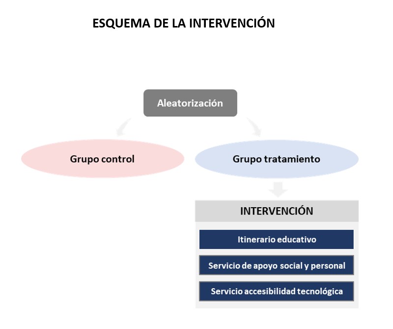 La intervención, que duró 9 meses, desarrolló actividades en los ámbitos de digitalización; de educación, y acompañamiento social y non take-up. Las familias fueron asignadas aleatoriamente entre el grupo de tratamiento o intervención o y el grupo de control o comparación. Las familias asignadas al grupo de intervención participaron en un itinerario con tres ámbitos de intervención: ● Un itinerario educativo que consistió en refuerzo y apoyo extraescolar y orientación educativa con el alumnado y sus familias. En concreto, se establecieron aulas de refuerzo escolar en grupos de aproximadamente ocho personas del mismo nivel educativo, durante seis o cuatro horas semanales de lunes a jueves (dependiendo del nivel educativo), además de sesiones individuales opcionales los viernes. Además, los orientadores educativos diseñaron un plan de acción personalizado para cada estudiante, realizando sesiones periódicas de tutoría y entrevistas con las familias para supervisar el rendimiento del mismo y orientar a otros miembros de la familia. ● Un servicio de apoyo social y personal orientado a familias para facilitar el acceso a recursos, promocionar hábitos saludables, apoyar la gestión de la vivienda y los recursos, y el desarrollo de competencias básicas como autoconocimiento, autoestima, motivación personal, habilidades sociales y de comunicación y gestión del tiempo. ● Un servicio de accesibilidad tecnológica consistente en préstamo de ordenadores, punto de acceso a internet y la adquisición de competencias digitales dirigido a familias y alumnado. El grupo de comparación no recibió ningún tipo de intervención, salvo apoyos concretos relacionados con necesidades básicas, como el acceso a prestaciones como el IMV o en caso de emergencias, que por motivos de responsabilidad ética la entidad decidió atender. 399 familias participaron en este proyecto, de las cuales 197 fueron asignadas aleatoriamente al grupo de tratamiento (270 menores) y 202 familias fueron asignadas al grupo de control (268 menores). La unidad de aleatorización fue la familia.