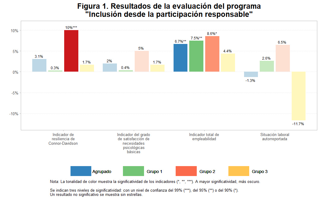 La Figura 1 muestra el porcentaje incremental de cada indicador de resultado principal (medido al final de la intervención) para cada grupo de tratamiento (Grupo 1, Grupo 2, Grupo 3), así como para el Agrupado (que aglutina Grupo 1, Grupo 2 y Grupo 3), comparado con el grupo de control.