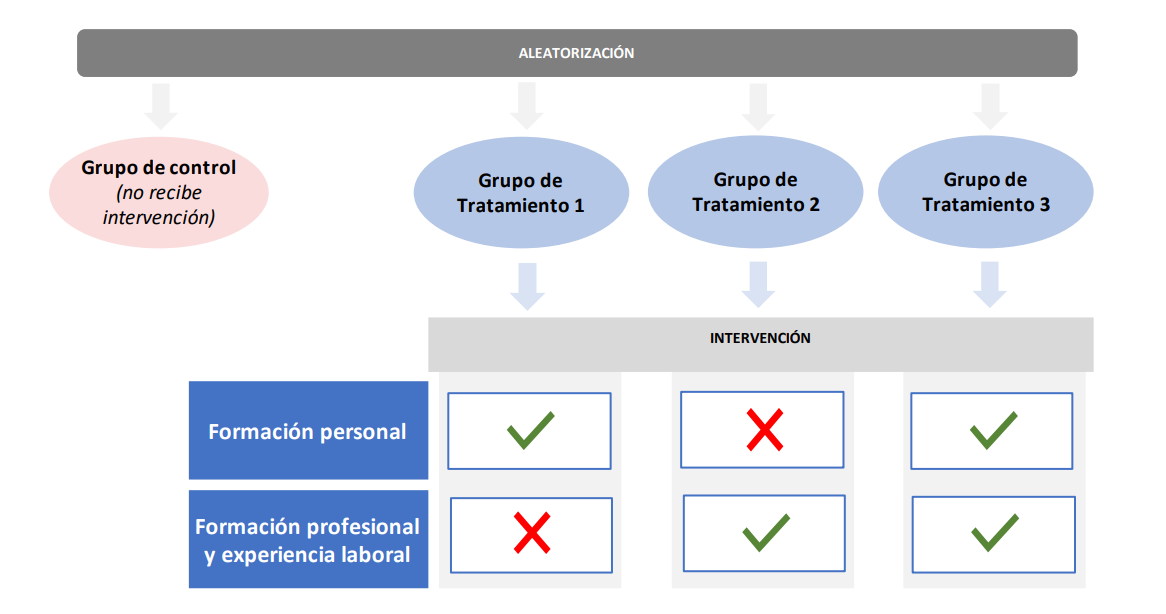 La intervención principal, que duró 2 meses, consistió en la realización y evaluación de talleres de formación personal dirigidos a la mejora de la autoestima y el empoderamiento personal, y talleres colectivos de formación profesional. Las personas participantes se asignaron aleatoriamente entre tres grupos de intervención o tratamiento y un grupo de control o comparación. Las personas de los grupos de intervención recibieron acompañamiento relativo con apoyos de tipo psicosocial para la mejora de la autoestima y talleres relacionados con el empleo centrados en los perfiles de ayudante de cocina, camarero/a de sala y auxiliar de limpieza civil. Se realizaron tres intervenciones distintas, dividiendo a los participantes del grupo de intervención en tres grupos, en función de la intervención que recibieron. Mientras que el primer grupo de intervención recibió talleres de formación personal dirigidos a la mejora de la autoestima y del empoderamiento personal, el segundo grupo recibió formación profesional a través de cursos en diferentes perfiles (ayudante de cocina, camarero/a de sala y auxiliar de limpieza civil) y prácticas en empresa. Por otro lado, el tercer grupo recibió tanto la formación personal, como la formación profesional y prácticas en empresa. El grupo de control no recibió ningún tipo de intervención. 374 personas participaron en este proyecto, de las cuales 194 fueron asignadas aleatoriamente a los grupos de tratamiento y 180 fueron asignadas al grupo de control.