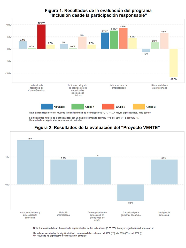 Las Figuras 1 y 2 muestran el porcentaje incremental de cada indicador de resultado principal (medido al final de la intervención) para el grupo de tratamiento comparado con el grupo de control.